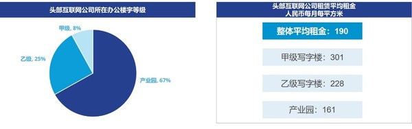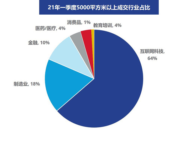 高力国际在整理了北京约150家头部互联网科技公司在京办公租赁情况后发现,当前头部互联网公司办公面积(包含自用和租赁面积)共约525万平方米,其中前20的公司办公面积约422万平方米,占总互联网公司办公面积的80%。有42%的互联网公司位于上地,位于东西两大组团内的互联网企业占比高达72%。同时,互联网公司更加集中于产业园市场,有67%的互联网公司位于产业园内,位于甲级写字楼的比例仅8%。在租金方面,互联网科技公司目前平均租金水平相对较低,平均租金约190元每月每平米,低于整体办公市场223元每月每平米的水平。此外,当前互联网公司依旧维持了迅猛的扩张速度。在2020年全年5000平米以上的大宗租赁成交中,互联网科技公司的成交面积占比达到42%,远高于第二名金融行业的18.8%,在今年一季度这个比例更是上升到64%。这个比例还没有计入去年融资如火如荼的在线教育行业,如果把在线教育新租面积也计入的话,2020年的互联网科技行业占比超过50%,今年一季度的占比更是接近70%。