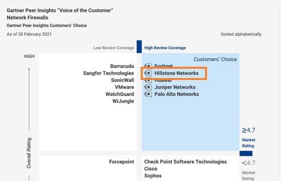 2020年,Gartner首次发布Peer Insights网络防火墙“客户之选”报告。想要入选报告并获得高分,厂商须满足多项条件:Gartner在Peer Insights客户点评服务平台上收集的众多网络安全厂商客户的真实评价,每一条客户点评都要经过专业审核团队筛选,以保证点评专业可靠,真实反映产品情况。此外,作为面向全球的点评平台,Peer Insights上的点评代表着全球客户对防火墙的多维度的需求,更具参考价值。