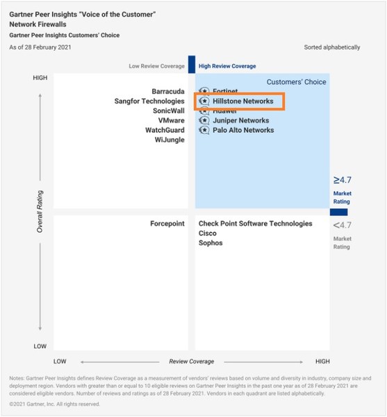 北京2021年4月19日 /新闻稿网 - Xinwengao.com/ — 4月14日,全球权威咨询机构Gartner发布了2021 Gartner Peer Insights “Voice of the Customer”报告。基于终端用户和专业人员对产品和解决方案的反馈和评价,山石网科以4.8分(满分5分)的客户评分,连续两年获得网络防火墙“客户之选”荣誉称号,成为全球仅有的五家、中国仅有的两家获此殊荣的厂商之一。同期入选的其他四家企业分别为:Juniper NetWorks、华为、Fortinet、Palo Alto NetWorks。