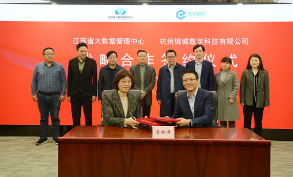 南京2021年4月20日 /新闻稿网 - Xinwengao.com/ — 为推动数字政府建设和创新应用,提供更加高效优质的公共服务,4月15日,江苏省大数据管理中心与链城数字科技有限公司签署战略合作协议。 链城数科与江苏省大数据管理中心签署战略合作协议 双方就共同探索区块链工程研究,打造“数字政府”区块链典型应用,推进区块链基础设施建设及人才培养等方面展开合作。中心党委委员、副主任陈俊和链城数字科技有限公司董事长金国军分别发表致辞。中心党委委员、副主任忻超及相关处室负责人参加了此次仪式。 链城数科董事长金国军表示,期待未来双方进一步加深合作,共同探索区块链在助力数字政府建设和创新应用方面的作用。