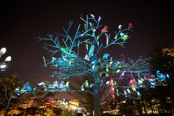 该作品是艺术家持续进行中的以关注人类语言多元生态环境的公共项目《语林计划》的衍生之一。当人聚集在站满小鸟的大树底下,小鸟灯随即感应点亮,人越多,灯亮得越多,反之随着人的离开散去,灯光渐稀。隐喻我们的语言,用得越多,越丰富而具有生命力,用得越少,越容易消亡。