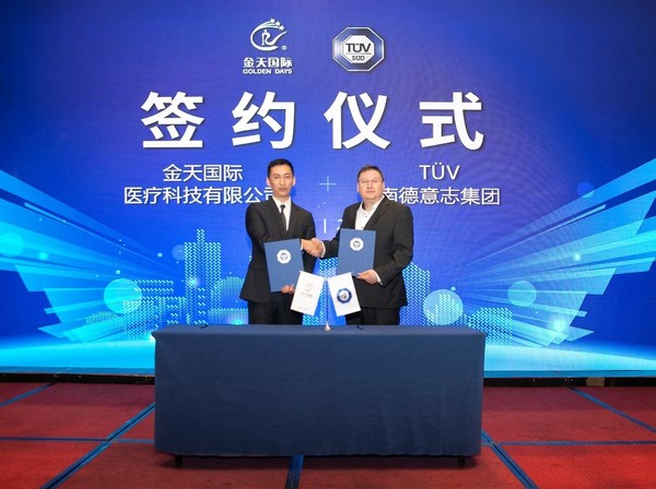 烟台2021年5月8日 /新闻稿网 - Xinwengao.com/ — 4月27日,TUV南德意志大中华集团(以下简称“TUV南德”)与金天国际集团(以下简称“金天国际”)于山东烟台举行长期战略合作签约仪式。伴随着此次合作协议的签署,双方未来将在产品认证、检测、检验等领域加强协作,并通过资源共享等方式共筑未来合作新模式。TUV南德产品服务部副总裁Lutz Langguth、TUV南德食品、健康与美护部门高级经理张闯、金天国际副总裁祖威、金天国际副总裁邹雪萍、金天国际智造中心总经理吴倩等领导参加了签约仪式。 TUV南德产品服务部副总裁Lutz Langguth(右一)与金天国际副总裁祖威签署合作协议 TUV南德产品服务部副总裁Lutz Langguth在致辞中表示:“TUV南德作为一家具有150多年历史的全球知名的第三方检测认证机构,致力于为企业提供全方位的信息和一站式服务的解决方案,未来双方将通过专业的技术能力以及丰富的行业经验,推进业务创新,为双方在多个领域实现更加广泛的深度合作创造更大的发展空间。通过此次合作协议的签署,双方将大力推进在实验室建设与管理领域的全面深入协作,加强测试、审核、认证、培训等领域全方位战略合作。涉及的行业包括但不限于食品、农产品、化妆品、生物医药等。” 相关链接 : http://www.tuv-sud.cn