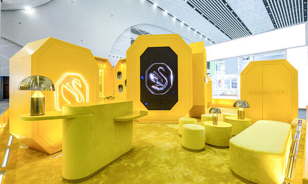 标志性天鹅形象焕新重构,以长颈展翅的优雅身姿,表现品牌满载信心、蓄势待发。外部八角形寓意“重生、无限、革新”及施华洛世奇经典的八角切割技艺 — 充满科技感的棱角分明与天鹅本身的柔美达成艺术平衡。金色象征高贵美好,真实还原近期在世界各地新开设的Instant Wonder门店概念,打造出仿水晶切割光芒折射出的美妙幻境。在这个科技与梦幻激烈碰撞的感官世界中,色彩、纹理、金属雕塑及创新材料相得益彰,展现施华洛世奇新设计语言的大胆探索和自我表现。