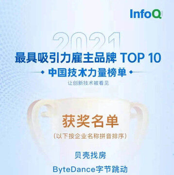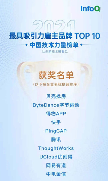 北京2021年5月10日 /新闻稿网 - Xinwengao.com/ — 近日,由InfoQ主办的中国技术力量之“最具吸引力雇主品牌”榜单评选活动落下帷幕,并揭晓了最终入围TOP10的企业名单。中电金信凭借在金融IT领域深耕多年的技术实力和口碑,成功上榜InfoQ“2021最具吸引力雇主品牌TOP10”和“2021最受开发者喜爱的企业TOP10”两项榜单。