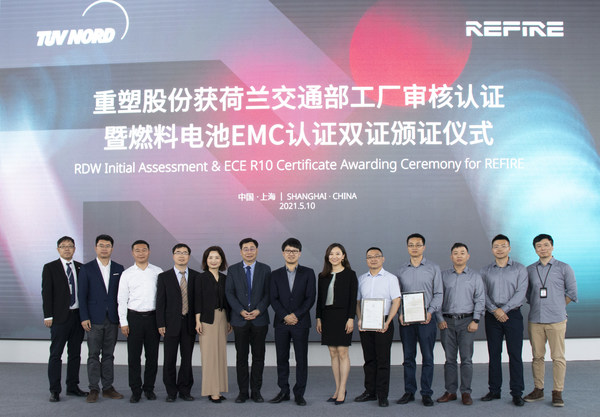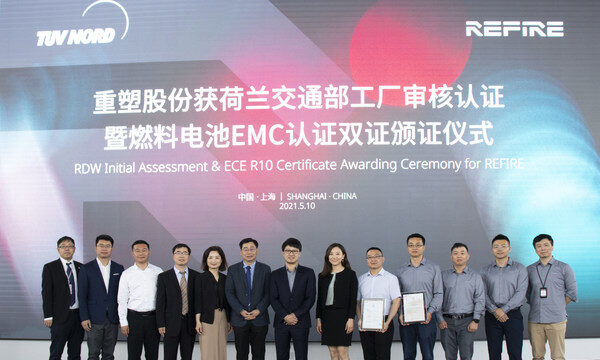 上海2021年5月12日 /新闻稿网 - Xinwengao.com/ — 2021年5月10日,重塑股份获荷兰交通部工厂评估暨燃料电池EMC认证双证颁证仪式在重塑股份上海总部顺利举行。TUV NORD亚太区总裁兼大中华区董事长任骏,重塑股份董事长兼CEO林琦,TUV NORD全球可再生能源高级副总裁兼大中华区副总裁须婷婷,TUV NORD亚洲区工业高级副总裁兼大中华区副总裁范江锋及双方企业高层代表出席了此次颁证仪式。