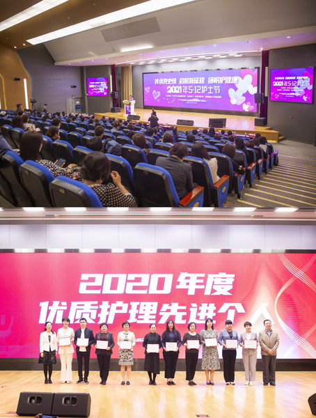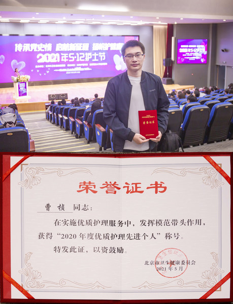 在大会上,北京市三级以上医疗战线上的102名护理工作者获“北京市2020年度优质护理先进个人”荣誉称号。北京陆道培医院护士曹桢是其中“先进个人”之一,并作为10名先进个人代表上台领奖。