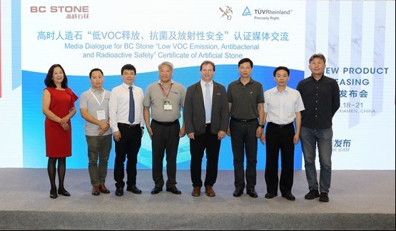 厦门2021年5月19日 /新闻稿网 - Xinwengao.com/ — 5月18日,德国莱茵TUV大中华区(以下简称 “TUV莱茵”)联合高时(厦门)石业有限公司(以下简称“高时石业”)举行了“低VOC释放、抗菌及放射性安全”人造石产品发布会。厦门海关技术中心副主任王伟、石材实验室主任蔡继杰,高时集团董事长高忠麟、总经理邓庆乐,TUV莱茵大中华区认可与认证副总裁霍扬(Jan Hoehne)、TUV莱茵福建公司总经理陈俊东等三方代表出席了活动。