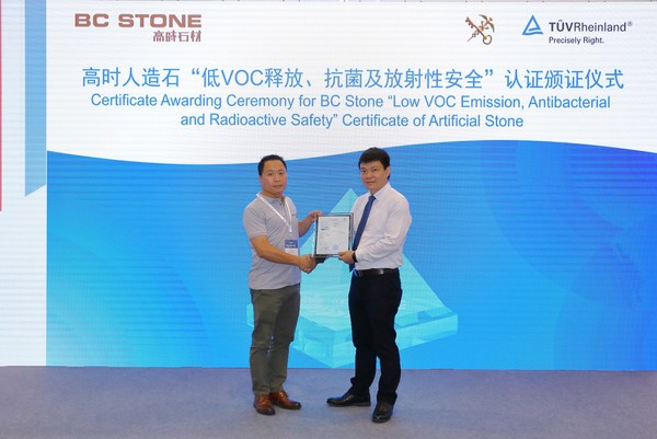 会上,TUV莱茵为高时人造石颁发了“低VOC释放、抗菌及放射性安全” China-mark(中国标识)认证证书。近两年,高时人造石以卓越的品质,先后通过了TUV莱茵“放射性安全检测”、“耐紫外老化200小时”、“低VOC释放”、“抗菌产品”、“防霉”等China-mark认证。以大众关注的抗菌性能为例,经检测,高时人造石抗菌性能和抗菌耐久性均达到99%以上,历经28天的测试,没有霉菌生长,防霉效果优异。同时,高时石业的质量管理体系能有效保障产品质量的持续性,对人造石材行业的功能性产品评价起到了示范作用。