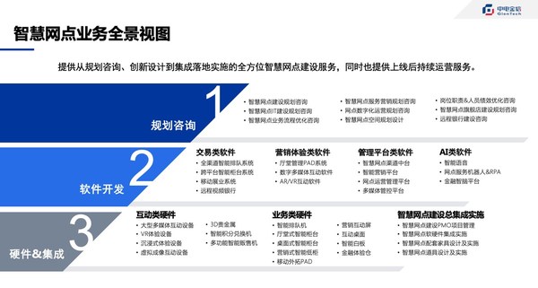 中电金信以“智能化、智慧化、生态化”为核心,面向银行业正式推出全新的智慧银行网点整体解决方案,以包括咨询规划、设计、场景、软件产品全生命周期在内的一整套方案,破解了智慧银行网点升级改造的难题。