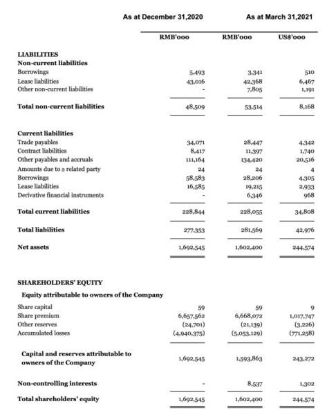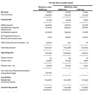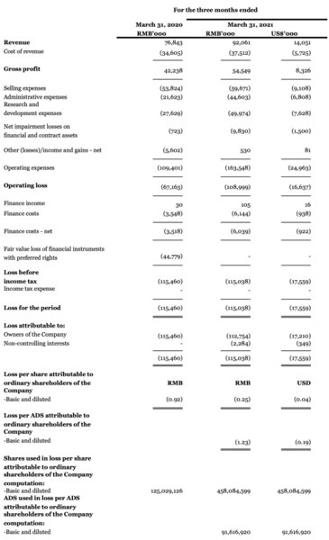 截至2021年3月31日,当期亏损为1.15亿元人民币(17.6百万美元),去年同期为1.155亿元人民币。