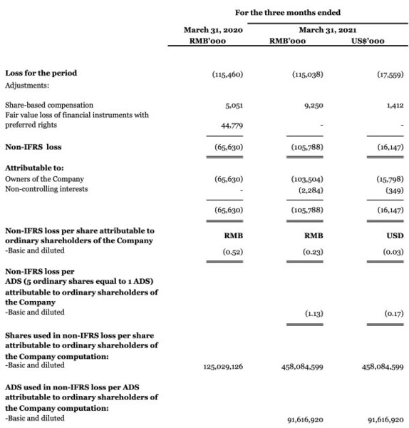 2021年第一季度归属公司普通股股东基本每股净亏损为人民币0.25元(0.04美元),去年同期归属公司普通股股东基本每股净亏损为人民币0.92元。扣除股权激励费用、优先股公允价值变动损失以及优先股其他损失后,Non-IFRS归属公司普通股股东基本每股净亏损为人民币0.23元(0.03美元),2020年同期归属公司普通股股东基本每股净亏损为人民币0.52元。摊薄归属公司普通股股东基本每股净亏损等于归属公司普通股股东基本每股净亏损。每股ADS代表五份普通股,票面价值为每股0.00002美元。详情请参阅本新闻稿中“对于非国际财务报告准则(Non-IFRS)财务指标的衡量”部分。