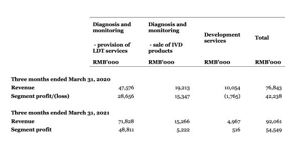 2021年第一季度诊断和监测业务收入为87.1百万元人民币(13.3百万美元),2020年同期收入为66.8百万元人民币,同比增长30.4%,这主要得益于LDT检测服务。