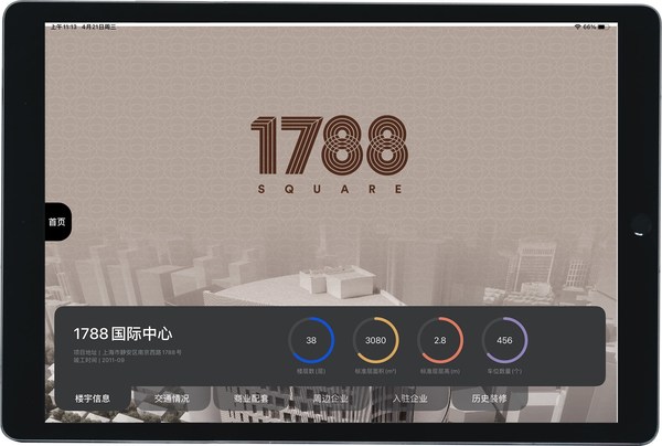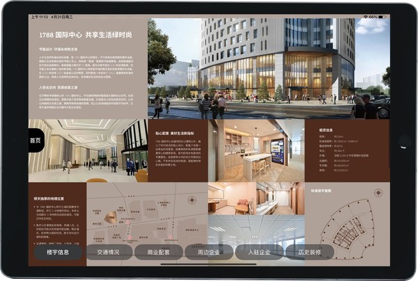 首要提及的inSolution功能是电子楼书,客户可以在inSolution配套提供的IPAD上,以可视化方式快速、直观地看到楼宇信息、交通概况、商业配套、周边企业、入驻企业、历史装修等相关信息,让客户快速了解楼宇概况。