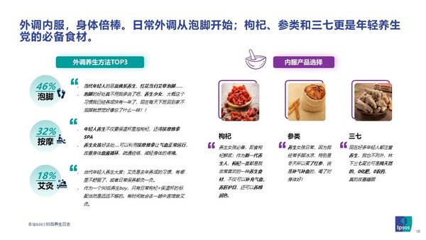 工作学习和熬夜通宵让90后不得不开始关注养生。益普索Ipsos数据显示,情绪健康(26%)、身材管理(22%)、睡眠改善(14%)是90后的前三大健康诉求。同时,位列前三的高增长健康需求为睡眠(+25%)、脱发(+22%)和口腔问题(+20%)。他们追求药食同源,内服外调两手抓,同时普遍认为摄入类食物与产品的选择都能对养生起到效果。在内服的食品中,保健品成为众多选项之一,且同比去年增幅达40%。