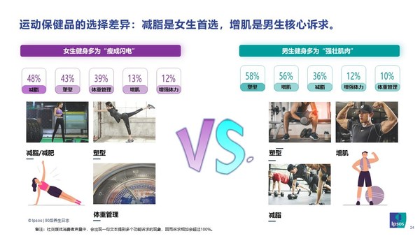 当下年轻人对于身材的焦虑感增大,他们将健身作为生活的日常。益普索Ipsos数据显示,女性健身的目标多为减脂(48%),而男性的诉求则多为塑性(58%)和增肌(56%)。因此不同性别的健身党,对保健品的需求也各不相同。女性通常寻求含白芸豆等促进脂肪分解的产品,男性则更多选择蛋白粉等可以增加肌肉量和蛋白质的产品。