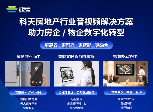 科天基于十几年的音视频技术积累和服务运营经验,结合地产行业业务需求和属性,通过提供智能客服&视频客服、智慧物业IoT、智慧办公协作等音视频解决方案,有效加强了地产业务场景和内部沟通等多个关键环节的数字化水平,以技术创新驱动房企加速增长。