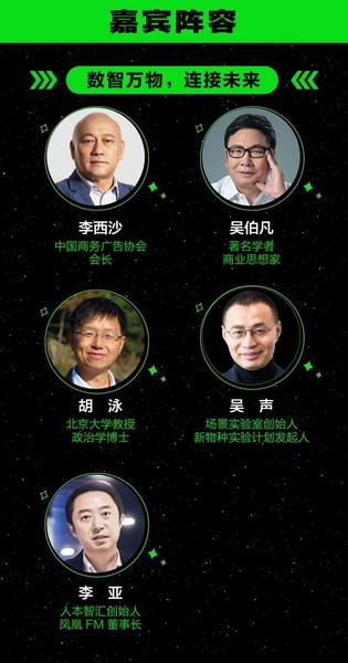 除此之外,在开幕论坛当中,邀请到了四位跨领域行业专家,包括著名学者/商业思想家吴伯凡、北京大学教授/政治学博士胡泳、场景实验室创始人吴声及人本智汇创始人/凤凰FM董事长李亚,将带来一场跨界视听盛宴。
