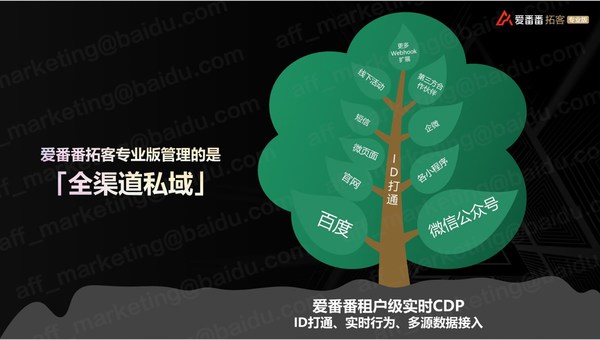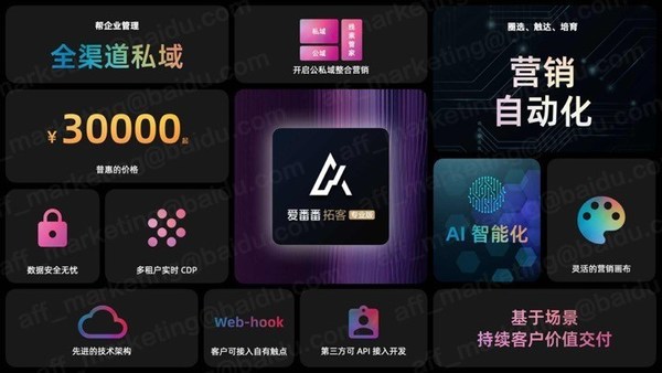 百度爱番番拓客专业版除了有聚焦私域的核心功能外,还同时具备公域营销和线索管家的能力。公域营销所产生的线索将实时无损自动地进入到线索管家,公域营销没有转化成线索的这些潜客,将会自动地进入到私域营销,进入到营销自动化旅程当中去进行培育,培育成功的线索又会进入到线索管家中持续管理。因此,爱番番给客户提供了一个无缝、一体化的产品体验,不仅把公私域整合营销这个方法论提供出来,同时也提供落地这个方法论的产品能力。
