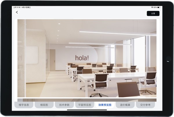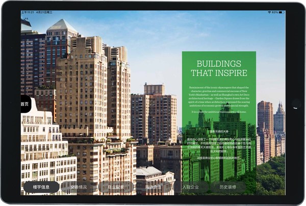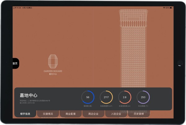 第二个体验升级是电子楼书。inSolution采用技术将数字空间置入楼宇账户配套专属的IPAD上,仅需轻轻一划,客户便可快速对楼宇介绍、交通概况、商业配套、周边企业、入驻企业等相关楼宇信息一目了然,高效、便捷。