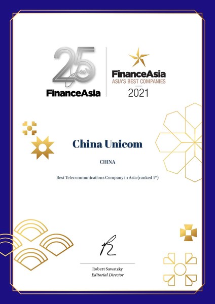 香港2021年6月3日 /新闻稿网 - Xinwengao.com/ — 中国联合网络通信(香港)股份有限公司(“中国联通”或“本公司”)(香港联交所编号: 0762)在权威财经杂志《金融亚洲》(FinanceAsia)举办的“2021年度亚洲最佳管理公司评选”中荣获专业投资者及分析师评选为“亚洲最佳电信公司”第一名。在是次评选中,中国联通同时荣获多个奖项,其中包括: “亚洲最佳电信公司”第一名 “中国最佳管理上市公司”第一名 “中国最佳首席执行官”第一名 “中国最佳投资者关系”第一名 中国联通获评选为“亚洲最佳电信公司”第一名 中国联通能够获取上述殊荣,显示中国联通不断努力完善公司治理和提升执行力,深受专业投资者及分析师认同,并为亚太区内领先水平,特别是公司积极助力疫情防控,坚定实施聚焦创新合作战略,加快推进全面数字化转型,网络共建共享成绩斐然,混改效能进一步释放,公司在高质量发展道路上继续迈出坚实步伐。中国联通衷心感谢资本市场和投资者对公司的支持和信任。 作为亚太地区最具权威的财经专业杂志之一,《金融亚洲》至今已经连续二十一年举办“亚洲最佳管理公司评选”。 今年度的评选结果由全球众多基金经理及投资分析师投票选出在管理、投资者关系、环境保护、社会责任及公司治理等各个领域表现领先的亚洲公司。
