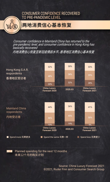 与去年3月疫情暴发期间的调研结果相比,两地消费者的消费信心呈现全面恢复的态势。对于未来12个月的购买计划,41%的内地受访者和33%的香港地区受访者表示会增加奢侈品花费,基本恢复到疫情前的情况。9%的内地受访者表示会减少花费,这一数字与2019年底疫情发生之前的调研结果(10%)基本持平。而28%的香港地区受访者表示会减少支出,相较于疫情前的20%仍有所增加。