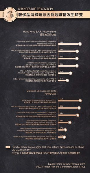与此同时,新冠疫情也进一步加速了奢侈品的数字化进程,55%内地受访者和63%香港地区受访者表示,新冠疫情以来他们开始更多地通过网络渠道购买奢侈品。