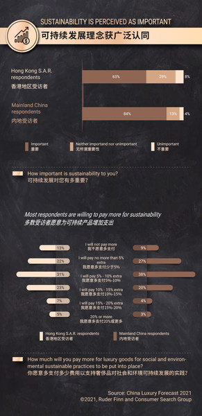 两地均有约九成的受访者愿意多支付费用以支持奢侈品对社会和环境可持续发展的实践。其中,愿意多支出5%-10%的受访者最多,超过三成。对于在可持续发展方面无所作为的品牌,92%内地受访者和81%香港地区受访者表示将或多或少地减少甚至停止购买该品牌的产品。