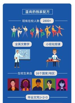 国际化教学特色,也培养了学生国际化视野,引领温肯学子走向世界舞台。截至今年5月,温肯已走出五届本科毕业生共计1600多人,超60%的学生选择继续留学深造,其中46%入学QS排名前50名的世界名校其中不少学生进入哈佛大学、芝加哥大学、伦敦大学学院、新加坡南洋理工大学、哥伦比亚大学、宾夕法尼亚大学、北京大学等世界顶尖名校。除此,四大会计师事务所、华为、汇丰、字节跳动、腾讯等头部企业也纷纷向温肯学子递来橄榄枝。