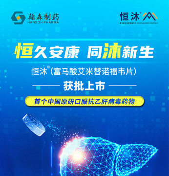 恒沐®是翰森制药自主研发的新型第二代替诺福韦,也是首个中国原研口服抗乙型肝炎病毒(HBV)药物。富马酸艾米替诺福韦片是一种新型核苷酸类逆转录酶抑制剂,通过优化结构,拥有更高细胞膜穿透率,更易进入肝细胞,实现肝靶向,同时有效提高药物血浆稳定性,降低全身TFV暴露,长期治疗更安全。