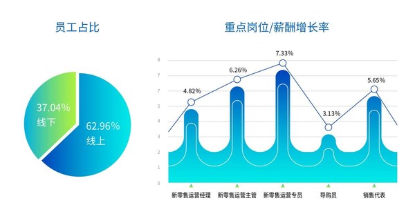 不可否认,新零售的到来带动了大量市场营销人员的增长,从薪酬水平来看,线上营销人员的人员占比及平均薪酬均高于线下。