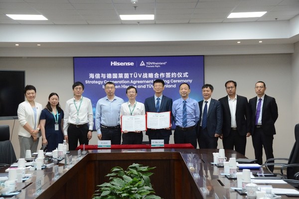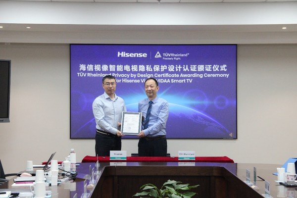 上海2021年6月25日 /新闻稿网 - Xinwengao.com/ — 6月25日,德国莱茵TUV大中华区(简称“TUV莱茵”)为海信视像科技股份有限公司(简称“海信”)的VIDAA 72671平台智能电视产品颁发了ETSI EN 303 645物联网(IoT)产品网络安全和隐私保护标准认证证书,海信成为全球首个获此证书的电视品牌。TUV莱茵大中华区工业服务与信息安全事业群副总裁、高级工程师陈伟康博士、TUV莱茵青岛公司执行董事王会波、TUV莱茵大中华区工业服务与信息安全总经理赵斌、海信集团控股公司副总裁、电子信息集团总裁、视像科技公司总裁于芝涛、国际营销助理副总裁刘勇等双方代表出席了颁证仪式。