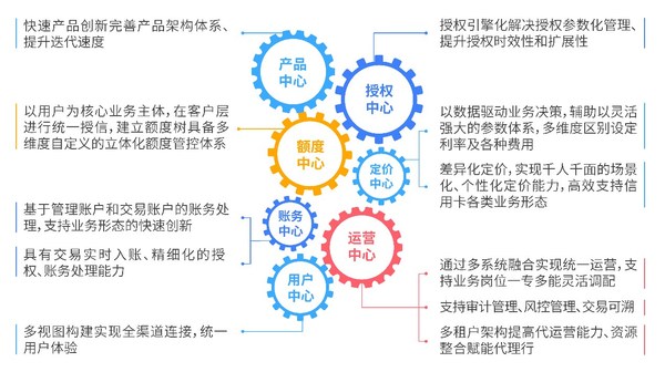新一代信用卡核心系统基于微服务化的基本思想,建立各种彼此独立又互相协作的产品中心、定价中心、额度中心、授权中心、账务中心、运营中心、用户中心等,并以此为依托进行产品创新和业务的集中运营,从多层面有效支撑银行信用卡业务的飞速发展。