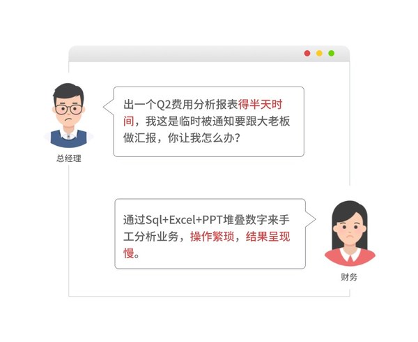 传统费用分析方式不仅效率低下,且由于各个业务系统中存在分散数据和报表形成数据孤岛,数据分析起来过于表面,没有进行深入分析,对于管理层而言,辛苦一天做出来的报表,可能根本用不上。
