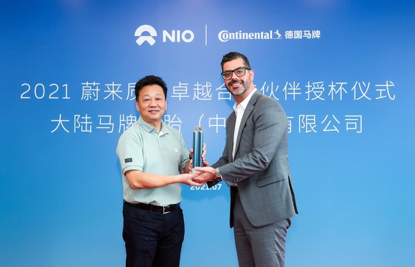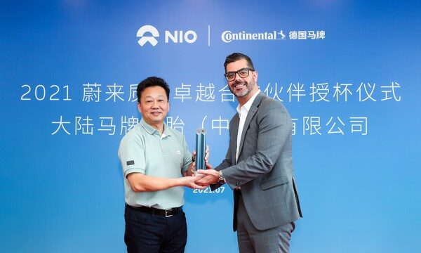 德国马牌轮胎荣获NIO蔚来“2021蔚来质量卓越合作伙伴”奖项。图左:蔚来执行副总裁兼质量委员会主席,沈峰博士;图右:德国马牌亚太区副总裁、轿车及轻卡车胎原装配套业务,Dr. Juan Botero。