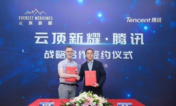 上海2021年7月12日 /新闻稿网 - Xinwengao.com/ — 云顶新耀(Everest Medicines ,HKEX 1952.HK),一家专注于创新药开发及商业化的生物制药公司,致力于满足大中华区,以及亚洲其他市场尚未被满足的医疗需求,公布已于7月10日与腾讯在上海签署战略合作备忘录,双方将充分整合各自领域的专长优势,以创新合作机制,打造便捷的疾病诊疗和管理模式,高效服务医生和患者,提升大众健康管理水平。云顶新耀首席执行官薄科瑞博士与腾讯医疗副总裁张猛先生分别代表双方出席并签署了战略合作备忘录。