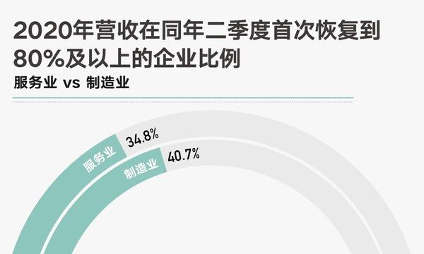 去年的《2020年中国商业报告》中,无论是制造业还是服务业,都认为营收会在短期内恢复到80%,服务业和制造业分别有42%和48%的企业预计到2020年二季度末在华商业运营能恢复到80%或以上。