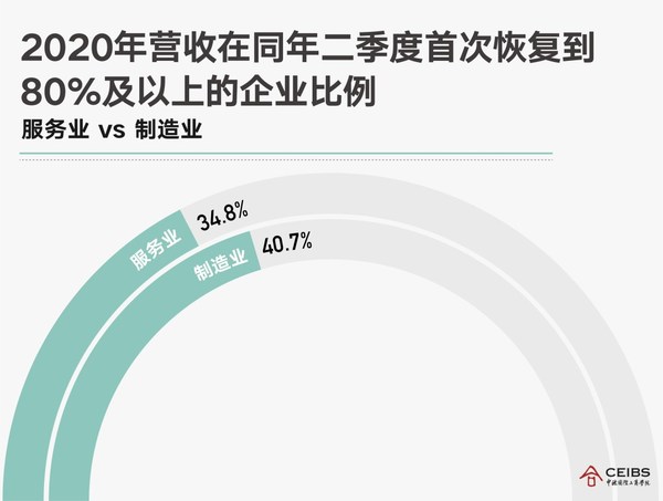 制造业和服务业的官方采购经理人指数(PMI)显示两个产业都在2020年3月就开始呈现出复苏态势,此后也一直在增长。然而, 今年的调查报告发现,根据2020年的营收结果看,制造业总体表现优于服务业。在新冠疫情冲击下,服务行业在华商业活动受到很大打击, 需要更长的恢复期才能达到疫情前的营收状态。