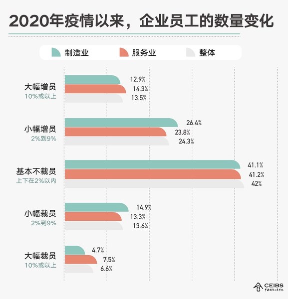 去年的报告发现在人事管理方面,不裁员和不降薪是绝大多数企业的做法。今年调查显示劳动力市场的整体情况更加好于预期,大规模的失业潮并未发生,部分行业或企业甚至还有增员。而我们也再次从这个维度看到服务业的复苏比制造业更不稳定。