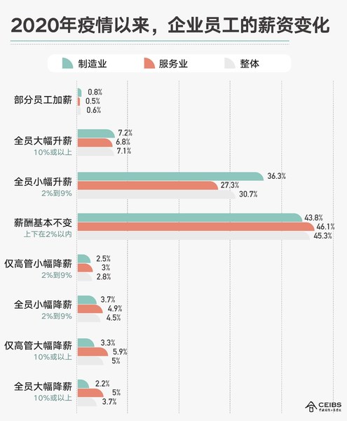 值得注意的是,今年有超过40%的企业加薪。制造业再次展现出了比服务业更加强劲的恢复情况。