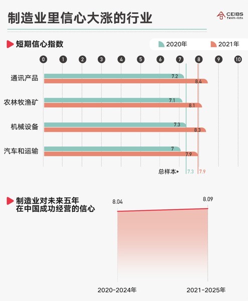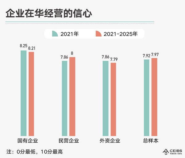 信心方面,去年调查报告显示企业对2020年在中国的成功经营信心分别如下:国有7.8,民营7.1,外资6.8。对于未来五年在中国经营的信心指数,情况如下:国有8.2,民营7.9,外资7.7。对比今年的调查结果我们发现,虽然短期信心有所上升,长期信心指数并没有明显变化。
