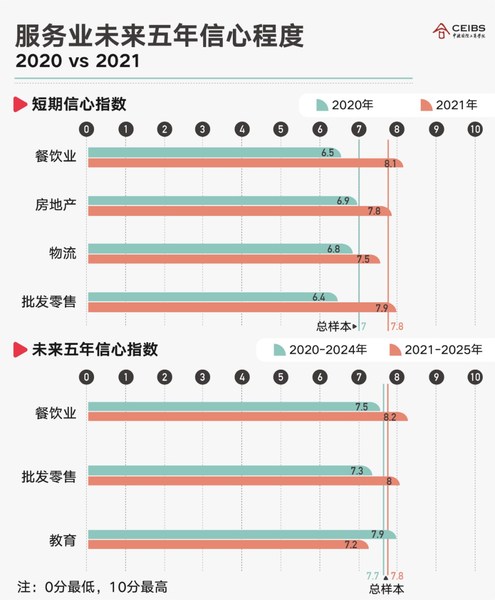 分行业来看,服务业中,餐饮业、房地产行业、物流业和批发零售业都信心大涨。但教育行业未来5年的信心有所下降。