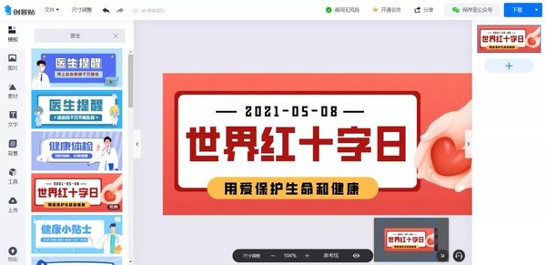 创客贴提供在线设计协作支持,医疗机构的服务特色、服务收费价格、患者案例、知识科普、活动资讯、医患关怀等内容,都可以应用创客贴进行创意生产,并展示、分发在不同的平台。双方通过产品的深度集成,即可实现在线使用20万+精品设计模板、8000万+正版字体、图片等版权素材,两百余种设计应用场景全覆盖,真正开启医疗行业全员创意生产时代。创客贴的应用,不仅解决了医疗机构设计资源紧缺的难题,还极大地优化了需求方与设计方之前的沟通流程,提高设计效率,提升内容传播效果。