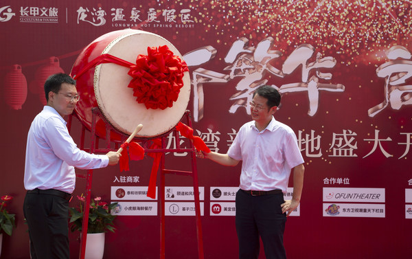 上海长甲集团文旅集团总裁梁晓磊先生;启东江海产业园管委会党工委书记陆燕飞先生;启东江海产业园管委会主任任锴胜先生等领导莅临现场,共同见证着新天地商业中心的繁华、古韵与风貌。随后四位领导亲自敲响镇业之鼓,开启龙湾新天地开街狂欢盛典。