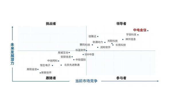 作为2020年度中国银行业IT解决方案市场领导者,中电金信定位为基于全栈信息技术的金融数字化咨询及解决方案提供商、重点行业数字化转型服务专家。在商业智能、客户关系管理、远程银行、支付清算、风险管理等领域处于市场领先地位,近年来在分布式核心领域也取得新的进展。