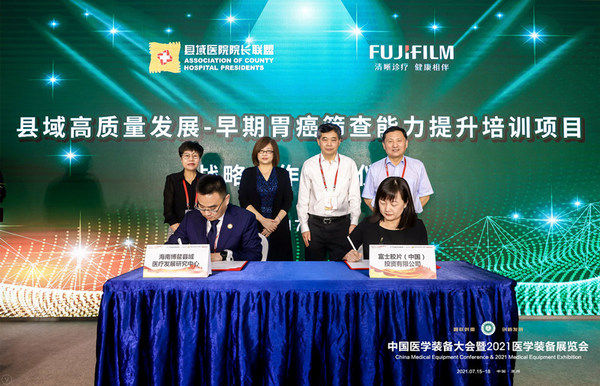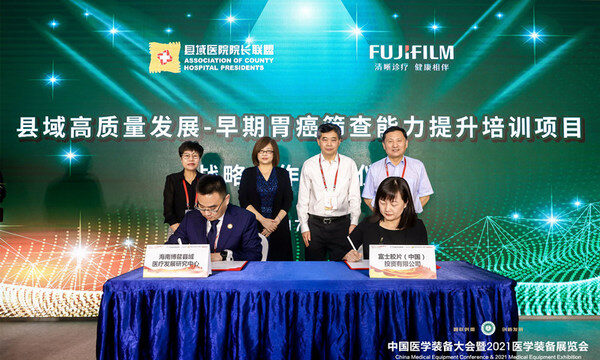 上海2021年7月22日 /新闻稿网 - Xinwengao.com/ — 2021年7月17日,由中国医学装备协会、中国医药企业管理协会、中国县域医院院长联盟、中国县域卫生联合举办的“‘健康中国 健康县域’2021中国县域健康大会”在苏州·国际博览中心召开。当天,中国县域医院院长联盟与富士胶片(中国)投资有限公司(以下简称富士胶片(中国))举办“县域高质量发展-早期胃癌筛查能力提升培训项目”战略合作签约仪式,富士胶片(中国)还获颁中国县域卫生授予的“县域卫生发展贡献奖”。