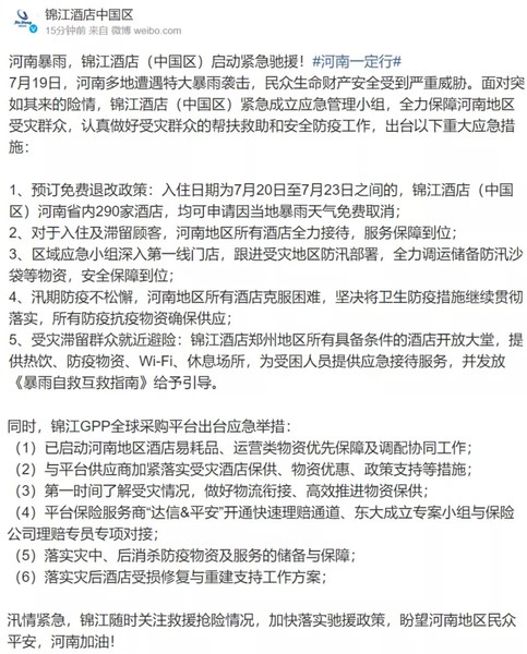 针对本次河南暴雨,锦江都城酒店自即日起推出酒店免费退单及启动相应应对预案,确保第一时间为宾客提供服务和支持。