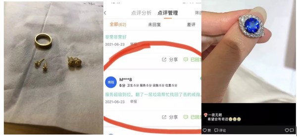 在房间每个角落翻查无果的情况下,大家并没有放弃,再次致电胡女士。在沟通中据她回忆推测,当时孩子在书桌翻玩首饰盒(盒内装了三个戒指),是不是有可能戒指在孩子玩的过程中掉出首饰盒呢?那房间的地上、所有的角落都寻遍了,还会在什么地方呢?对了,还有垃圾桶!放置在书桌下的垃圾桶!又非常幸运地是,胡女士退房较晚,她房间的垃圾在垃圾房内未被收运。此时已凌晨12点,垃圾房灯光昏暗、视线差,不宜查找,第一次翻箱后无果而返。急客人之所急,酒店坚决不放弃,客房部经理第二天一早七点不到就赶到酒店,和清理该房的服务员一起翻找,安保员工全程录像。酒店员工不怕脏不怕累,克服熏鼻的异味,再脏再小的纸团都不放过。半个多小时过去了,垃圾清理得差不多了,但还是没有找到,大家不气馁继续翻找。这时,有一包黑色塑料袋袋口露出珠宝展宣传资料的一角,客房部经理赶紧用力扯开,在一个透明小塑料袋中闪耀出蓝宝石的光芒,找到啦!