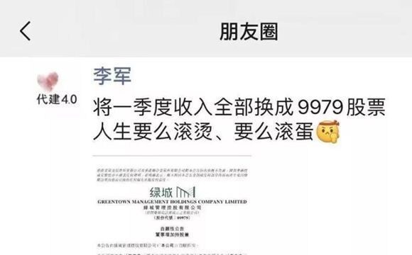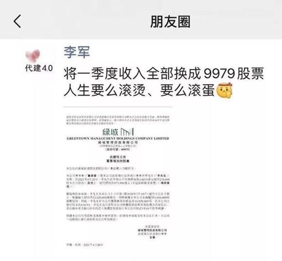 当然,股价的真正爆发是4月20日李军的朋友圈事件。一张增持公告另加一句“人生要么滚烫、要么滚蛋”,彻底点燃了资本市场的情绪,随后几天绿城管理的股价一度涨超40%,市值增长近30亿。