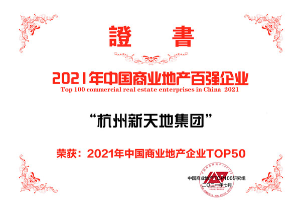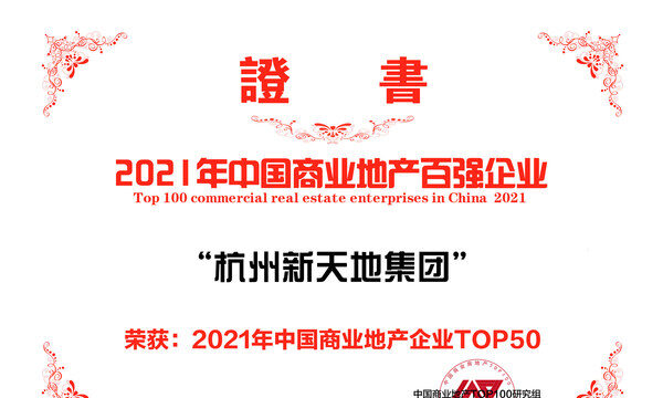7月30日,由中国商业地产TOP100研究组、中国城市开发投资500强研究组主办,中国房地产数据研究院承办的“城市开发投资复合研究发布高峰论坛”在上海盛大举办。论坛上,中国商业地产TOP100研究组发表研究成果,杭州新天地集团凭借不断提升的综合实力,荣获“2021中国商业地产企业TOP50”,这是新天地集团第二次获此殊荣。在2020年8月的房地产创新大会上,新天地集团首次入选中国商业地产50强榜单。