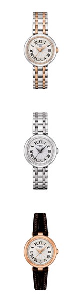 - 瑞士制造,直径26毫米,玫瑰金PVD表壳,蓝宝石玻璃表镜,实心后盖,白色陶瓷凸圆表冠,镌刻玫瑰圆花饰纹白色表盘,黑色镀镍时针和分针及罗马数字时标。搭载瑞士制造的ETA高精度石英机芯,配备棕色皮革表带,防水性能可抵御相当于5巴的压力。参考价格:3,200 RMB